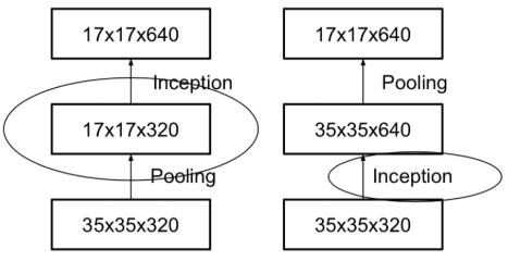 作者提出使用传统方法搭建卷积神经网络时候会使用一些池化操作以减小特征图大小。如图$7$左边先使用池化再进行卷积会导致瓶颈结构,违背$Inception$ $V2$的设计初衷;图$7$右边先使用卷积再进行池化,会增加计算成本: