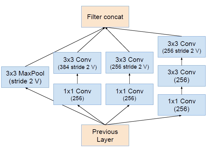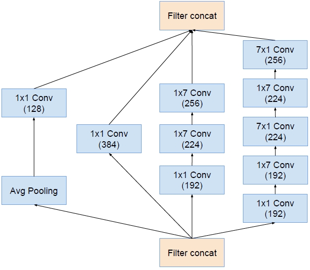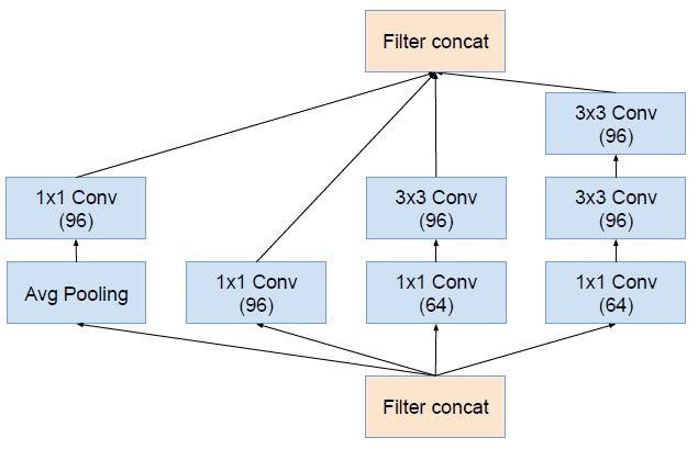 图$3$、图$4$和图$5$分别为$Inception-A$、$Inception-B$和$Inception-C$的结构图,可以看出来这三个子模块和$InceptionV3$中的子模块是非常相似的,只是相比于$InceptionV3$中五个子模块来说少了两个。