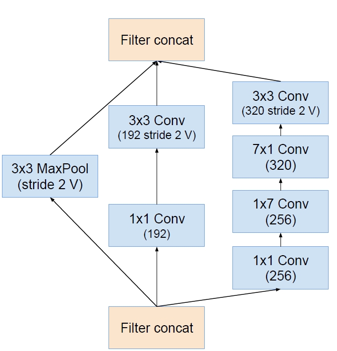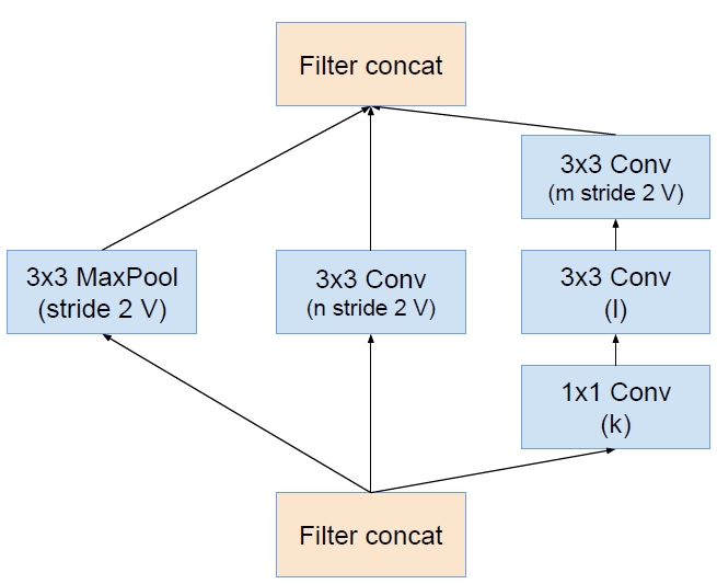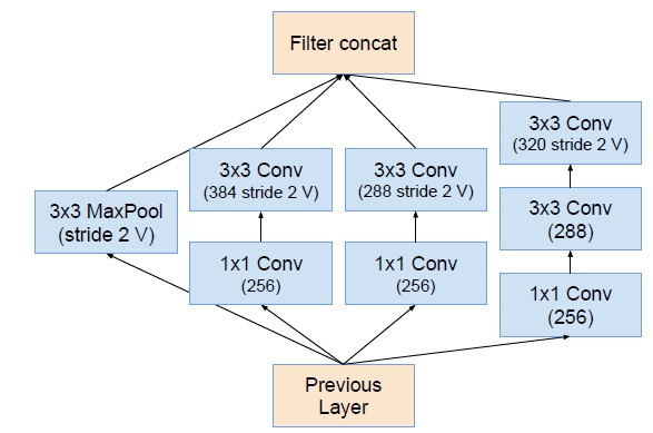 $Inception$ $v4$中引入了专用的$reduction$ $block$,它被用于改变网格的宽度和高度。$Reduction-A$实现了从$35$x$35$到$17$x$17$的尺寸缩减),$Reduction-B$(从$17$x$17$到$8$x$8$的尺寸缩减)。如下图6和图5所示,为$Reduction-A、B$结构。