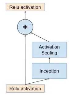 作者在训练过程中发现如果卷积核的数量超过$1000$,则网络架构更深层的残差单元将导致网络崩溃。即在迭代几万次之后,平均池化的前面一层就会生成很多的$0$值。即便通过调低学习率,增加$BN$层都没有任何改善。不过作者发现如果在将残差聚合之前,对残差进行缩放变小的话,可以让模型稳定训练,缩放值值通常选择$0.2$到$0.3$之间。如下图$18$所示。