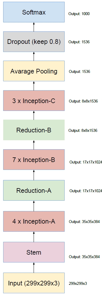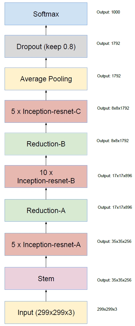 如下图$8$所示为$Inception-Resnet$的网络结构图。可以看出网络整体是由$Stem$、$Inception$和$Reduction$这三个模块组成的,其中$Inception$模块包含了$Inception$-$resnet$-$A$、$Inception$-$resnet$-$B$和$Inception$-$resnet$-$C$这三个子模块;$Reduction$模块包含了$Reduction$-$A$和$Reduction$-$B$这两个模块。