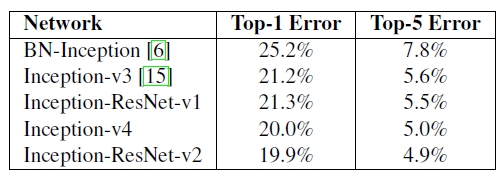 而在$Inception$-$resnet$-$v2$与$Inception$ $v4$的对比中,$Inception$-$resnet$-$v2$的训练速度更块,而且结果比$Inception$ $v4$也更好一点。所以最后胜出的就是$Inception$-$resnet$-$v2$。
