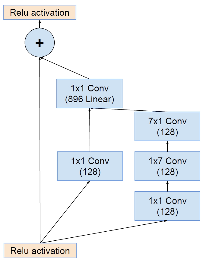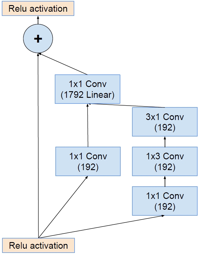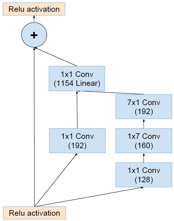 如下图$10$-图$13$分别为$Inception$-$resnet$-$V1$的$Inception$-$resnet$三个子模块和$Reduction$-$B$模块;图$14$-图$17$分别为$Inception$-$resnet$-$V2$的$Inception$-$resnet$三个子模块和$Reduction$-$B$模块。$Inception$-$resnet$-$V1$和$Inception$-$resnet$-$V2$的$Reduction$-$B$模块和上图$6$的$Inception$ $V4$的 $Reduction$-$A$保持一致。
