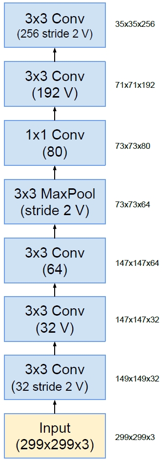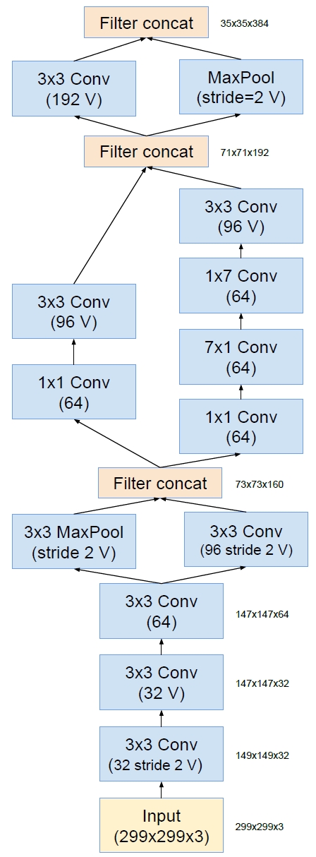 如下图2所示为$Inception$ $V4$的$Stem$结构模块,并且$Inception$ $V4$ 和$Inception-Resnet-V2$中都使用了这个结构。