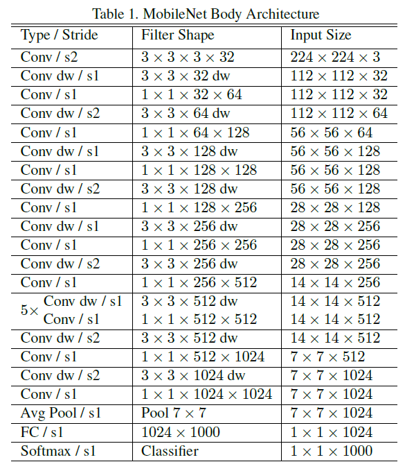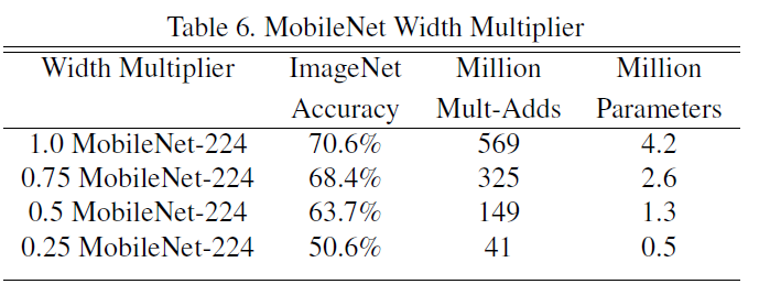 其中参数$α$,称为宽度因子。使用超参数$ɑ$对$DW$卷积核的个数以及$PW$卷积核的个数进行等比例缩小。因此其计算量变为:${D_K}$·${D_K}$·$ɑM$· $ɑ$$N$· ${D_F}$·${D_F}$这里的$ɑ$∈($0$,$1$], 这里的$ɑ$值分别取了$1$,$0.75$,$0.5$,$0.25$。当$ɑ$=$1$时即为上面的$MobileNet$结构。