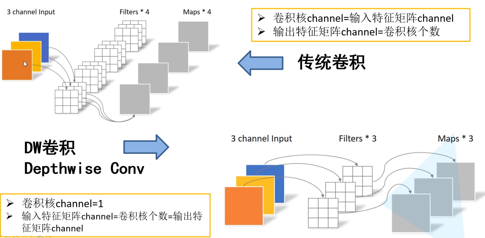 深度可分卷积是由$Depthwise$ $Convolution$(简称$DW$卷积)和$Pointwise Converlution$(简称$PW$卷积)组合而来,一般来说$DW$卷积用于提取特征,$PW$用于降低或者升高$channel$的维度。