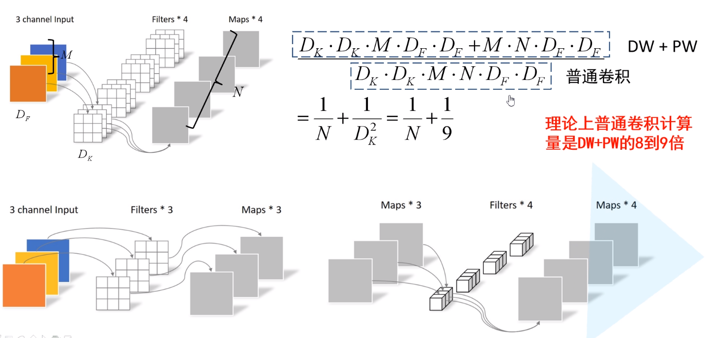 正常的卷积核如上图4的上半部中尺寸为${D_k}$×${D_k}$×$M$×$N$。其计算量为${D_k}$·${D_k}$·$M$·$N$·${D_F}$·${D_F}$。
