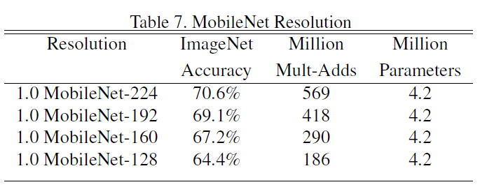 第二个参数$ρ$,称为分辨率因子。超参数$ρ$用来降低空间分辨率。用法和$ɑ$一样。因此其计算量变为:${D_K}$·${D_K}$·$ɑ{D_F}$ ·$ρM$ · $ɑ{D_F}$·$ρ$${D_F}$。这里$ρ$∈($0$,$1$]。因此空间分辨率变为了$224$,$192$,$160$或$128$,能够降低计算量,但无法降低参数量。