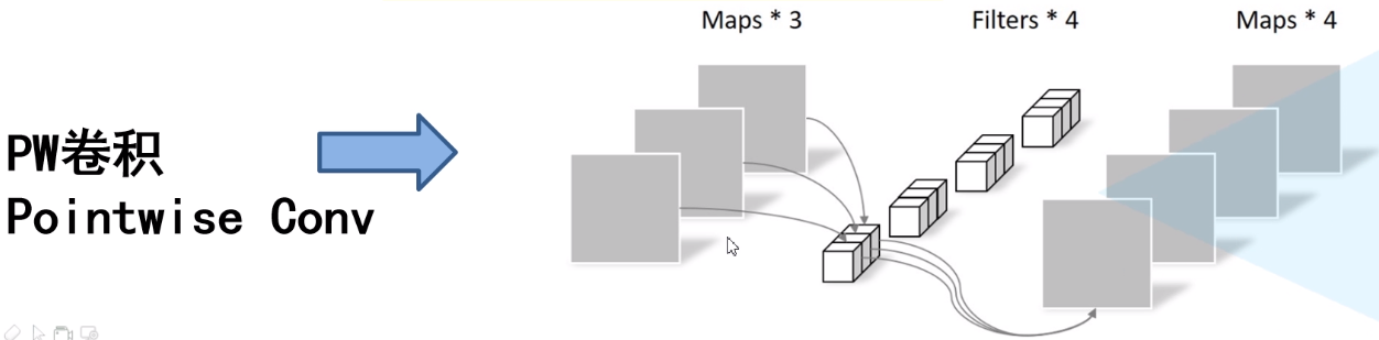 如下图$3$所示,其实$PW$卷积就是普通的卷积而已,只不过卷积核大小为1。通常$DW$卷积和$PW$卷积是放在一起使用的,先使用$DW$卷积提取特征,再使用$PW$卷积做通道维度的变换,二者合起来叫做$Depthwise$ $Separable$ $Convolution$(深度可分离卷积)。