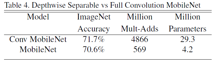 据此可知,$MobileNet$使用$3$x$3$深度可分离卷积能较少$8$-$9$倍的计算量,而精度只降低了一点点。具体如下图5所示: