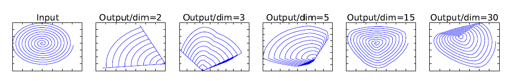 什么意思呢?作者在原论文中也给出了解释,如下图 $4$ 所示为将低维流形的 $ReLU$ 变换 $embedded$ 到高维空间中的例子,用比较通俗的话来讲就是将一个 $n$ 维的特征 $T$ 做 $ReLU$ 运算,然后利用 $T$ 的逆矩阵进行恢复,从图 $4$ 中可以看出,当 $n = 2,3$ 时,恢复出现的特征与 $Input$ 相比有很大一部分的信息已经丢失了。而当 $n$ = $15$ 到 $30$,还是有相当多的地方被保留了下来。也就是说,对低维度做 $ReLU$ 运算,很容易造成信息的丢失。而在高维度进行 $ReLU$ 运算的话,信息的丢失则会很少。