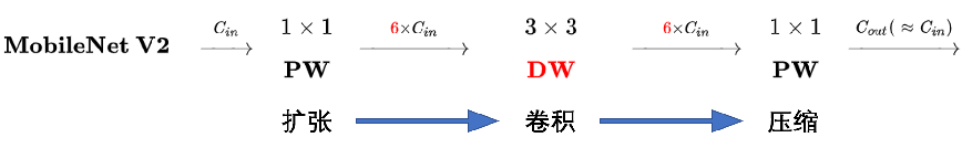 在 $MobileNet$-$V1$ 中的 $DW$ 深度卷积本身没有改变通道数量的能力,输入通道数等于输出通道数。如果来的通道很少的话,$DW$ 深度卷积只能在低维度上工作,这样效果并不会很好,所以作者提出要“扩张”通道。既然已经知道 $PW$ 逐点卷积也就是 $1×1$ 卷积可以用来升维和降维,那就可以在 $DW$ 深度卷积之前使用 $PW$ 卷积进行升维,再在一个更高维的空间中进行卷积操作来提取特征。如下图所示,这种在深度卷积之前扩充通道的操作在 $v2$ 中被称作 $Expansion$ $layer$,如下图 2 所示。
