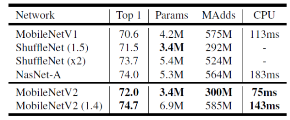如下图 1 所示为 $MobileNet$-$V2$ 和其他网络的一些性能对比。从图可知, $MobileNet$-$V2$ 相比于 $MobileNet$-$V1$ 性能提升了 $1.4$ 个点,并且参数量和计算量都降低了很多,单图推理性能达到 $75ms$。甚至于采用 α(在 $MobileNet$-$V1$ 中的宽度因子)=$1.4$ 的情况下,精确度上升至 $74.7$。