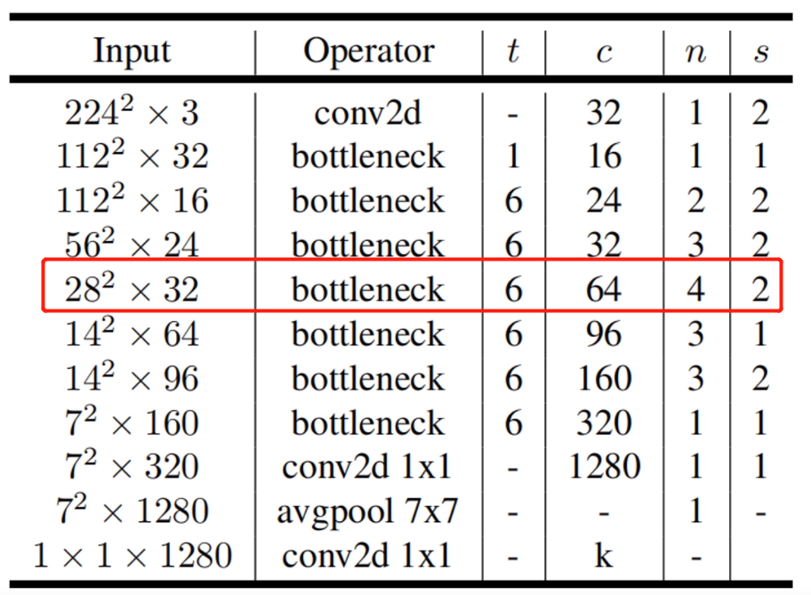 如下图所示为 $MobileNet$-$V2$ 的整体网络结构,在图中 $n$ 代表 $bottleneck$ 的重复次数,$s$ 代表步长,$c$ 代表输出维度。需要注意的是,在每一个重复的 $bottleneck$ 中只有第一层的 $bottleneck$ 的 $stride$ 为 $s$,其他的为 $1$,例如在 $28×28×32$ 的 $bottleneck$ 重复了四次,只有第一次的 $bottleneck$ 的 $stride$ 为 $2$,其余的为 $1$,原因是因为第一次的 $bottleneck$ 的 $stride$ 为 $2$,输入和输入的 $shape$ 不一样,因此采用的是上图 $6$ 中的右边的 $bottleneck$,而剩下的 $bottleneck$ 的 $stride$ 为 $1$,输入和输出 $shape$ 是一致的,采用的是上图 $6$ 中的左边的 $bottleneck$。