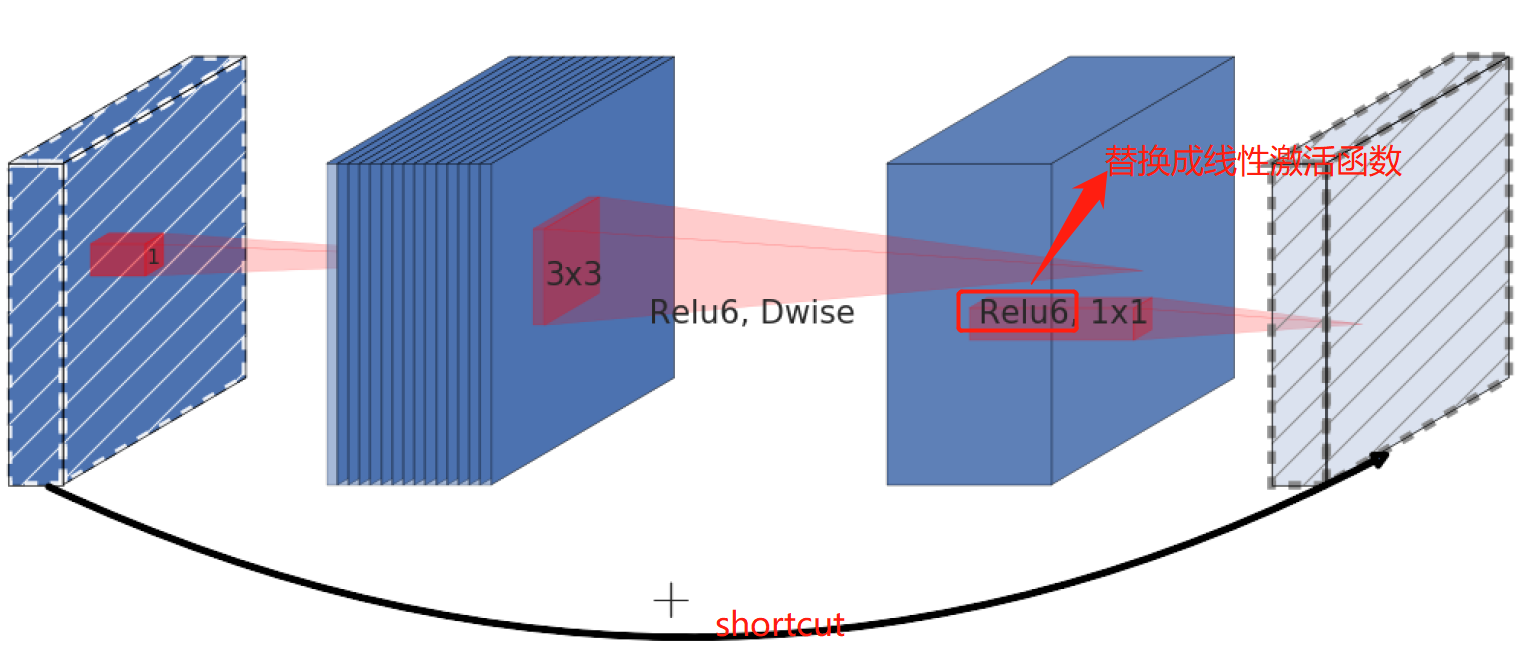 这就解释了为什么深度卷积的卷积核有不少值是空的。而作者给出的解决方案就是:既然是 $ReLU$ 导致的信息损耗,将 $ReLU$ 替换成线性激活函数,当然了并不是将所有的 $ReLU$ 函数都替换为线性激活函数,而是将 $Inverted$ $Residuals$(倒残差结构)中的最后一个 $Relu6$ 激活函数换成线性激活函数,如下图 $5$ 中所示,将红色框中的 $ReLU6$ 替换成线性激活函数。