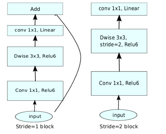 作者在采用了以上两种方式的改进后,最终的 $MobileNet$-$V2$ 的两种 $Inverted$ $Residuals$ $bottleneck$ 如下图 $6$ 所示,需要注意的时候,只有在 $stride$=$1$ 并且输入特征 $shape$ 和输入特征 $shape$ 一致的情况下才加入 $shortcuts$ 操作。如果是 $stride$=2 的话,则采用的是下图中右边的 $Inverted$ $Residuals$ $bottleneck$。