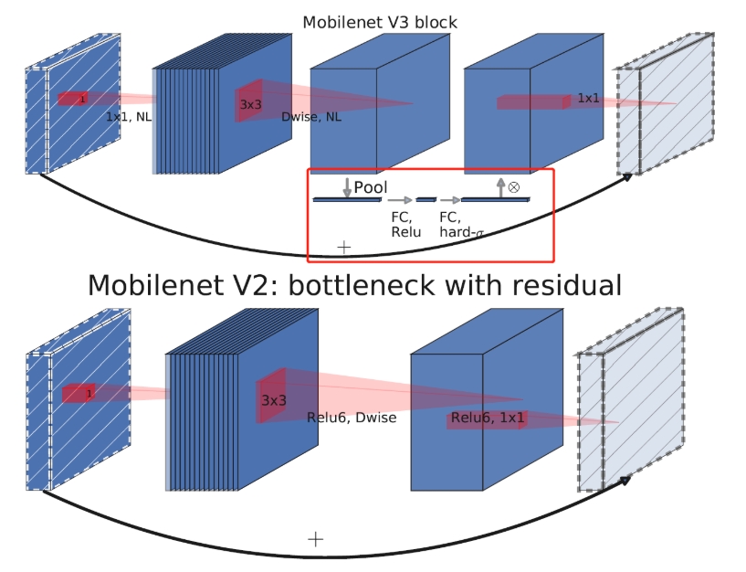 1、$MobileNet$-$V3$ 在 v2 的 block 基础上引入 Squeeze and Excitation 结构,增加了通道注意力机制。