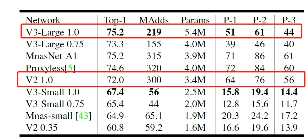 如下图 $1$ 所示为 $MobileNet$-$V3$ 和其他网络的一些性能对比。从图可知, $MobileNet$-$V3$ 相比于 $MobileNet$-$V2$ 性能提升了 $3.2$ 个点,在 $P-1$ 手机端单图推理性能达到 $51ms$。