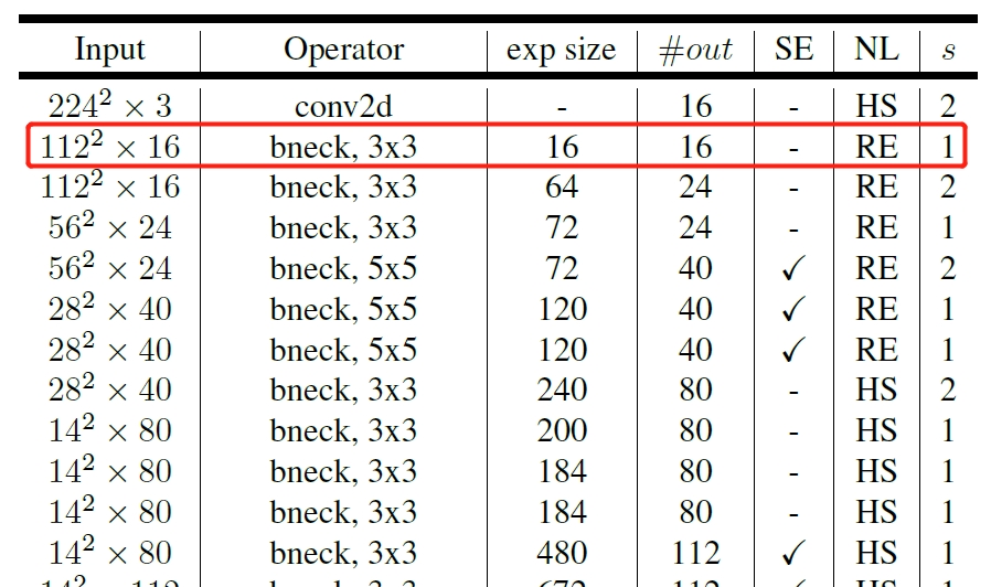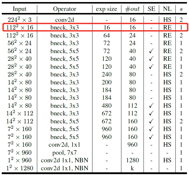 1、作者经过实验证明第一层的 $bneck$ 使用 $16$ 个卷积核和使用 $32$ 个卷积核的精度是一样,而使用 $16$ 个卷积核自然是可以提升推理速度。如下图 $5$ 中所示,第一个 $bneck$ 的采用 $16$ 个卷积核。