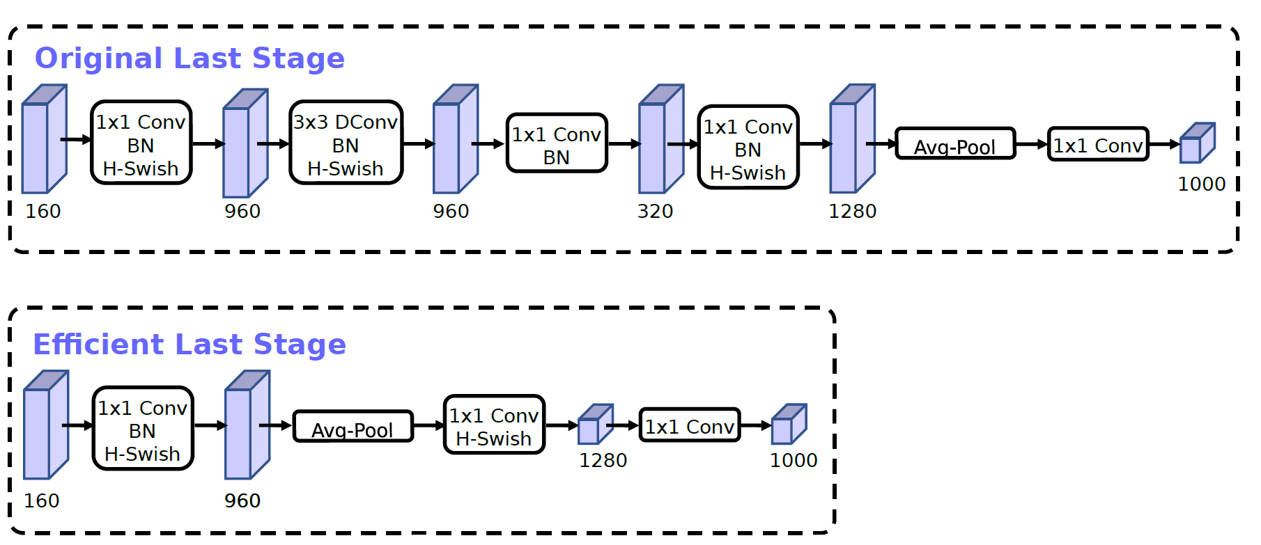 2、精简 $Last$ $Stage$:$MobileNet$ $v3$ 作者在使用 $NAS$ 搜索得到的网络最后的分类层叫 $Last$ $Stage$,如下图 $6$ 中上半部分所示,经过作者实验后采用下图下半部分的网络结构来精简 $Last$ $Stage$ 可以保证精度几乎不变的情况下,将单图推理性能提升 $11%$(减少约 $7ms$)。