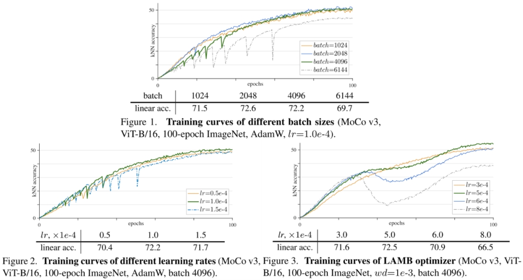 MoCov3将backbone替换成ViT,然后进行实验研究,探索Self-Supervised使用Transformer架构是否可行。然而实验中使用ViT作为backbone会导致Self-Supervised的训练过程不稳定,并且这个不稳定现象无法通过最终迁移预测的结果捕捉到。为了揭示这个不稳定现象是什么导致的,MoCov3使用kNN curves来监控self-supervised的每一个epoch结果。