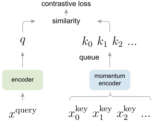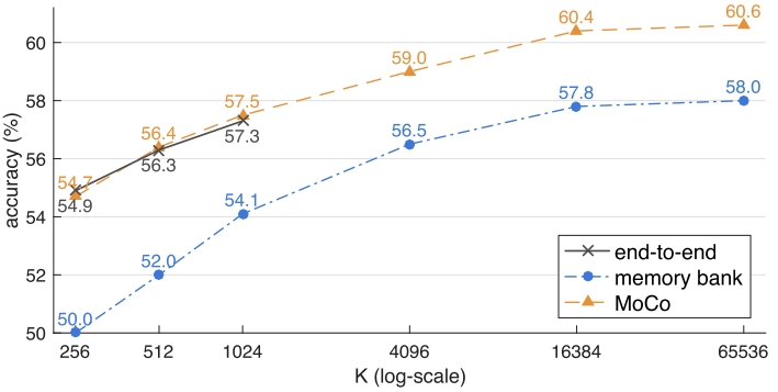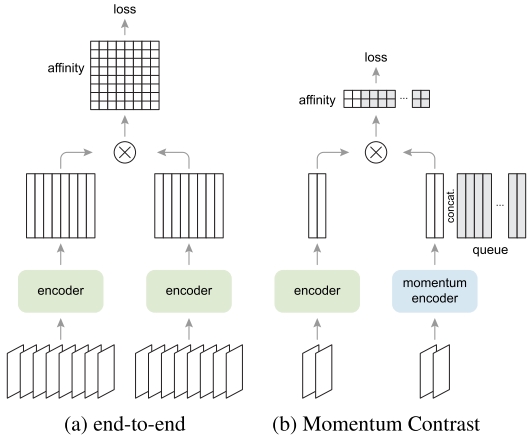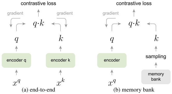 其中图(a)是最简单粗暴,直接end-to-end,batch size的大小取决于GPU容量大小。图(b)设计了一个memory bank保存数据集中所有数据的特征,使用的时候随机从memory bank中采样,然后对采样进行momentum update,这样可以认为多个epoch近似一个大的batch,但是这种方法存在一个问题,就是保存数据集中所有数据特征非常的占显存。