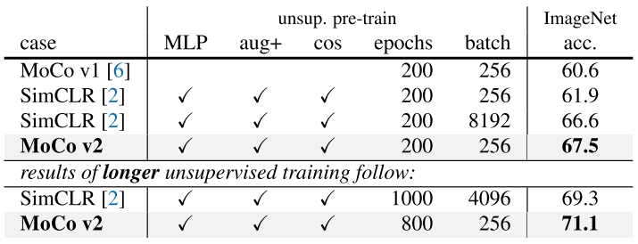 SimCLR其实使用的方法就是MoCo中提到的end-to-end的方法,当然同样存在GPU容量大小限制的问题,但是在Google面前,GPU容量大小算什么限制,TPU我有一打,于是SimCLR通过大batch、大epoch、更多更强的数据增强和增加一个MLP把MoCo拉下了王座,**MoCo当然不服气,SimCLR你作弊,老子也要用更多更强的数据增强和MLP!**于是MoCov2以一种实验报告的形式诞生了。
