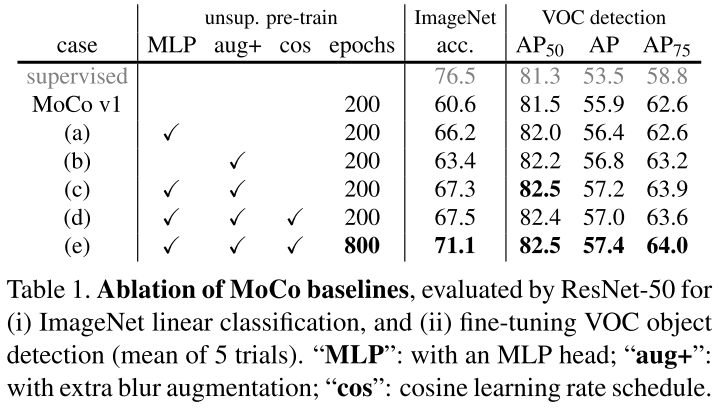 从实验中可以看出,增加MLP、更强的aug、大epoch都能够大幅度的提升MoCo的精度。