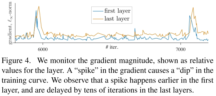 为了探究dip出现的原因,作者进一步画出随着epoch的增加,模型的first layer和last layer梯度的变化情况。发现在训练过程中,不同的layer都会发生梯度突变的情况,导致dip的出现。通过比较各个layer的梯度峰值发现first layer会更早的出现梯度峰值,然后逐层蔓延到last layer。