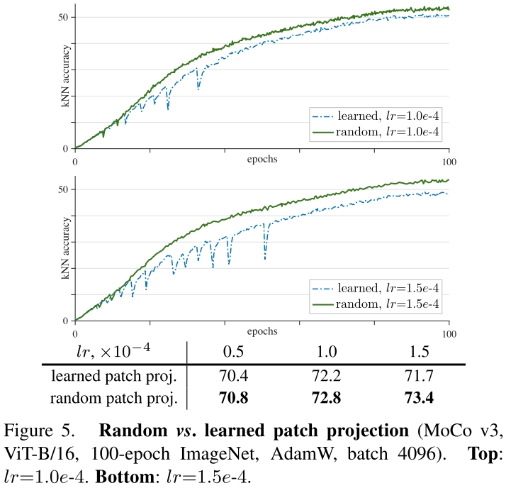 基于这个观察现象,作者大胆猜测不稳定现象在浅层会更早产生。于是作者进行消融实验比对fixed random patch projectionr和learned patch projection两种情况的结果。