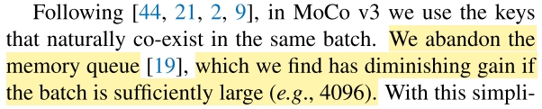 最后我想说的是,正如截图所示,虽然叫MoCov3,但其实越来越不像MoCo了,缺少了MoCo最精髓的dictionary as a queue,没有了MoCo的精气神,可以看出FAIR对于精度的无奈与妥协,MoCo最初的精彩或许只能存在于历史之中。