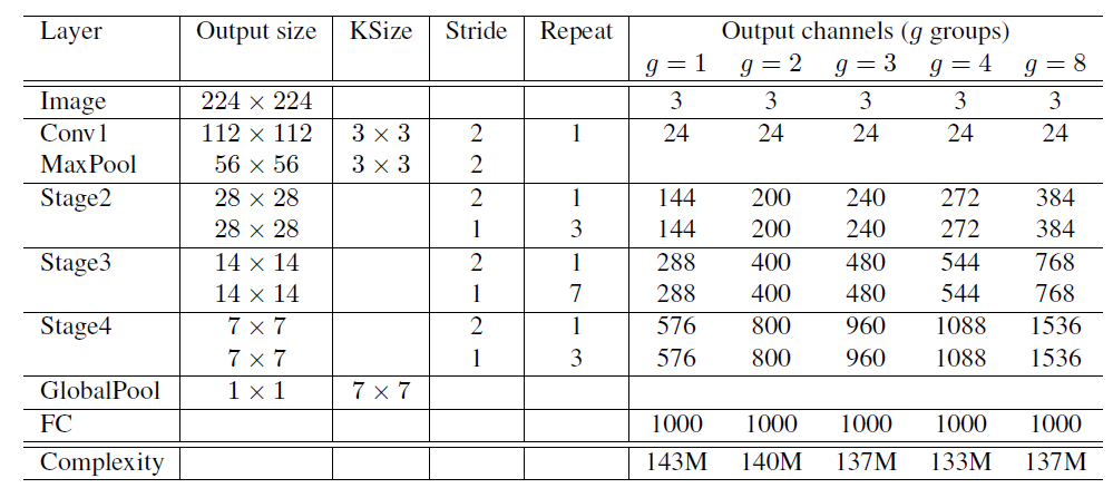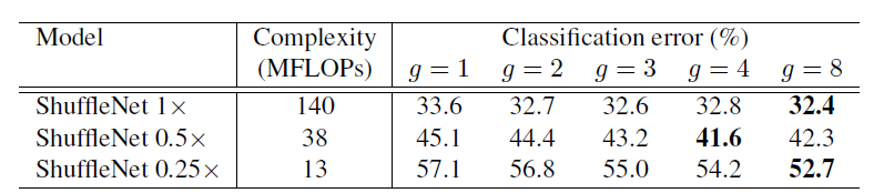 后面的 $ShuffleNet$ $unit$ 都是 $stride$=$1$,特征图和通道数都保持不变。其中 $g$ 控制了 $group$ $convolution$ 中的分组数,分组越多,在相同计算资源下,可以使用更多的通道数,所以 $g$ 越大时,采用了更多的卷积核。当完成三个 $stage$ 后,采用 $global$ $pool$ 将特征图大小降为 $1$×$1$,最后是输出类别预测值的全连接层。