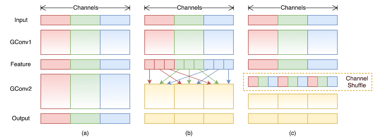 为达到特征之间通信目的,作者提出了 $channel$ $shuffle$。如图 $4$-$a$ 为正常采用组卷积提取出来的特征(相同颜色的通道表示是在同一个 $Group$)。图 $4$-$b$ 就是采用 $channel$ $shuffle$ 思想对 $group$ $convolution$ 之后的特征图进行“重组”,这样可以保证接下了采用的 $group$ $convolution$ 其输入来自不同的组,因此信息可以在不同组之间流转。图 $4$-$c$ 进一步的展示了这一过程并随机,其实是“均匀地打乱”。在程序上实现 $channel$ $shuffle$ 是非常容易的:假定将输入层分为 $g$ 组,总通道数为 $g$×$n$,首先将通道那个维度拆分为 $(g,n)$ 两个维度,然后将这两个维度转置变成 $(n,g)$,最后重新 $reshape$ 成一个维度 $g$×$n$。仅需要简单的维度操作和转置就可以实现均匀的 $shuffle$。采用 $channel$ $shuffle$ 之后就可以充分发挥 $group convolution$ 的优点,完美的避开其缺点啦。