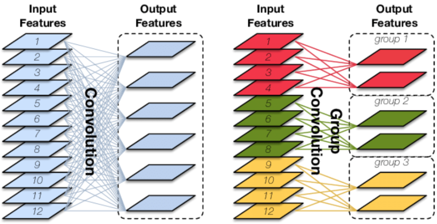 先简单介绍一下 $PointWise$ $Group$ $Convolution$(组卷积)的概念,如下图 $1$ 所示,左边为常见的普通卷积运算,输出的每一个维度的特征都需要输入特征的每一个维度经过计算获得,但这样的计算量会比较大。因而在 $Alexnet$、$ResNeXt$ 等网络中采用了 $group$ $convolution$,在输入特征图的通道方向执行分组操作得到最后的输入特征,如图 $1$ 中左边所示。$PointWise$ $Group$ $Convolution$ 只是 $group$ $convolution$ 的一种特殊形式,特殊的地方在于它的卷积核的核大小为 $1$*$1$。