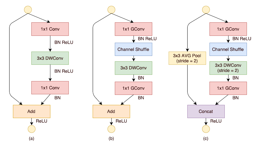 对于残差单元,如果 $stride$=$1$ 时,此时输入与输出 $shape$ 一致可以直接相加,而当 $stride$=$2$ 时,通道数增加,而特征图大小减小,此时输入与输出不匹配。为了解决这个问题在 $ShuffleNet$ 中,对原输入采用 $stride$=$2$ 的 $3$x$3$ $avg$ $pool$,这样得到和输出一样大小的特征图,然后将得到特征图与输出进行连接($concat$),而不是相加。这样做的目的主要是降低计算量与参数大小,如图 $5$-$c$ 所示。