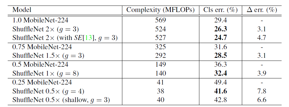 作者做了大量的对比实验来证明 $ShuffleNet$ 的优秀性能,这里给出一部分实验结果。