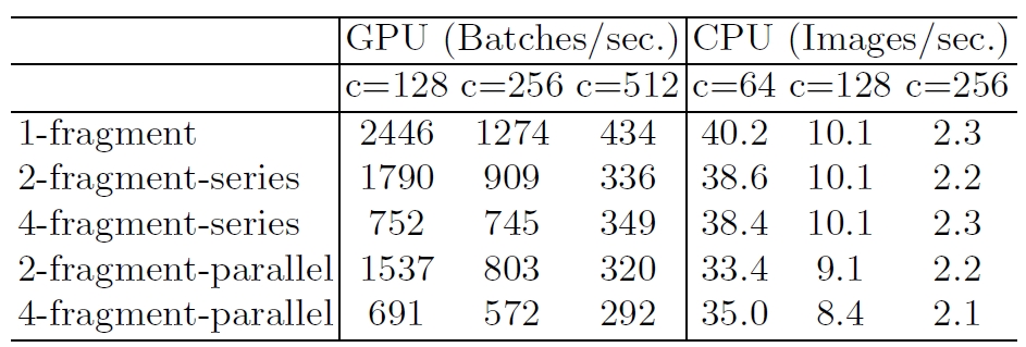 为了研究 $fragment$ 对模型速度的影响,作者做了第四个实验。如图 $5$ 所示,$1$-$fragment$-$series$ 表示单个卷积层;$2$-$fragment$-$series$ 表示一个 $block$ 中有 $2$ 个卷积层串行,也就是简单的叠加;$4$-$fragment$-$parallel$ 表示一个 $block$ 中有 $4$ 个卷积层并行,类似 $Inception$ 的整体设计。图 $6$ 为测试结果,可以看出在相同 $FLOPs$ 的情况下,单卷积层($1$-$fragment$)的速度最快。