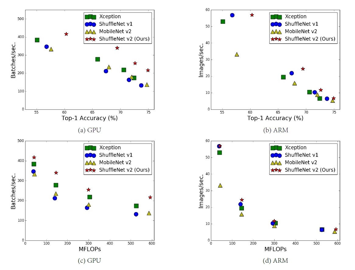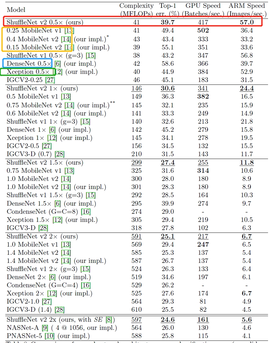 1、$ShuffleNet$-$V2$ 完善了网络性能对比的准则,以 $FLOPs$、推理速度和平台这三个因素来综合评价网络的性能。