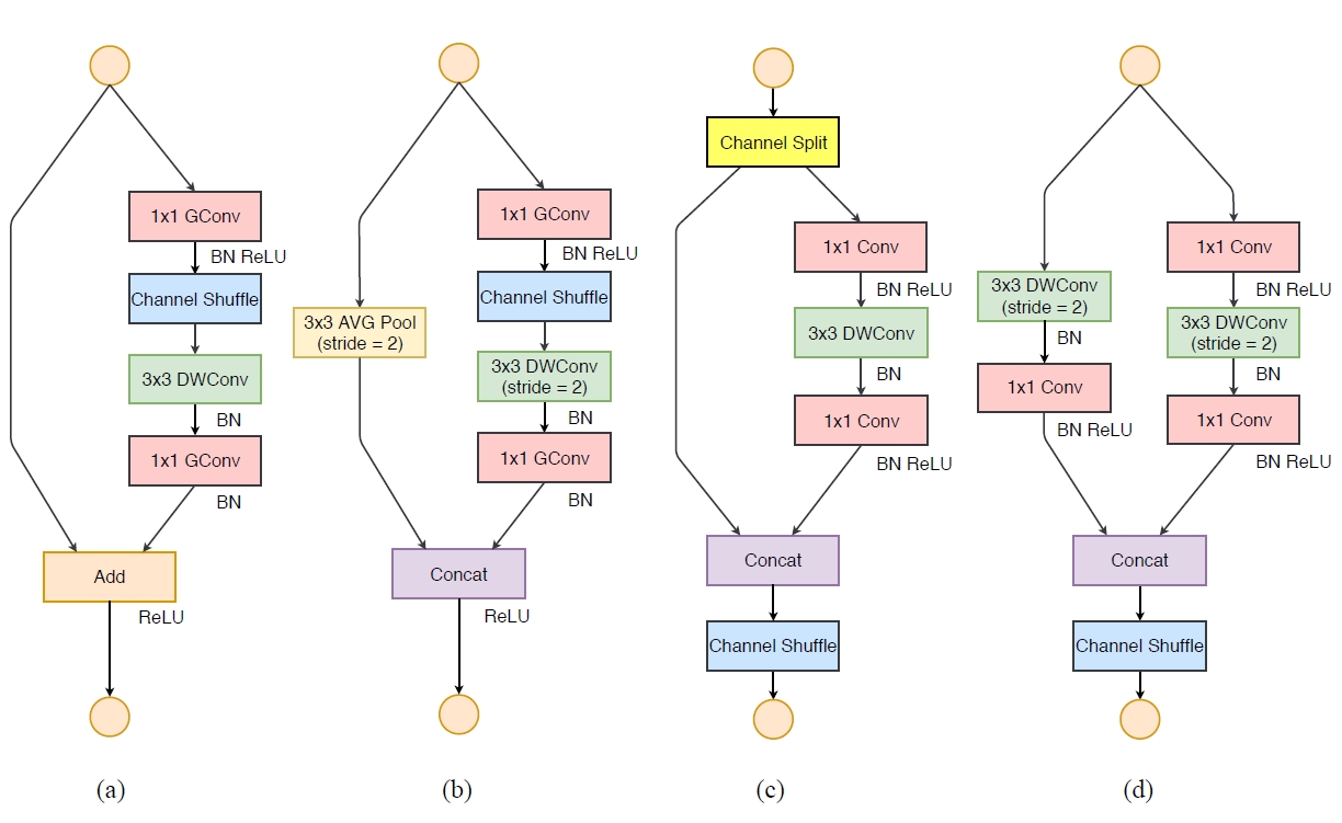 作者在遵循 G1-G4 的设计准则的条件下,对于 $ShuffleNet$-$V1$ 的 $unit$ 进行了改进,如下图 $8$ 所示为 $ShuffleNet$-$V1$ 和 $V2$ 的 $unit$ 对比。图 $8$-$a$ 和图 $8$-$b$ 分别为 $ShuffleNet$-$V1$ 中 $stride$=$1$ 和 $stride$=$1$ 的 $unit$,图 $8$-$c$ 和图 $8$-$d$ 分别为对应的改进版。