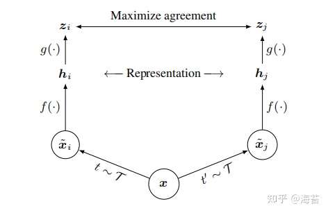 图 2. 视觉表征对比学习的简单框架。两个独立的数据增强算子从同一增强系列(t ∼ T 和 ∼ T )中采样,并应用于每个数据示例以获得两个相关视图。使用对比损失训练基本编码器网络 f(·) 和投影头 g(·) 以最大化一致性。训练完成后,我们扔掉投影头 g(·) 并使用编码器 f(·) 和表示 h 进行下游任务。