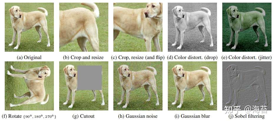 为了系统地研究数据增强的影响,我们在这里考虑了几种常见的增强。一种类型的增强涉及数据的空间/几何变换,例如裁剪和调整大小(水平翻转)、旋转和剪切。另一种类型的增强涉及外观变换,例如颜色失真(包括颜色下降、亮度、对比度、饱和度、色调)、高斯模糊和 Sobel 过滤。图 4 可视化了我们在这项工作中研究的增强。