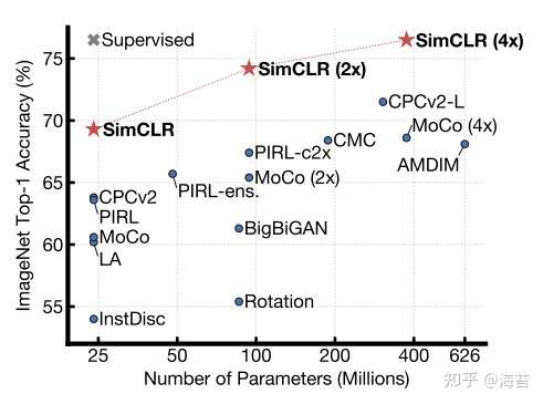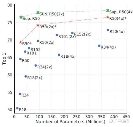 图 7. 具有不同深度和宽度的模型的线性评估。 蓝点中的模型是我们训练了 100 个 epoch 的模型,红星中的模型是我们训练了 1000 个 epoch 的模型,绿色十字中的模型是我们训练了 90 个 epoch 的监督 ResNets7(He 等人,2016)。