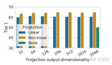 图 8. 具有不同投影头 g(·) 和 z = g(h) 的各种维度的表示的线性评估。 表示 h(投影前)在这里是 2048 维的。