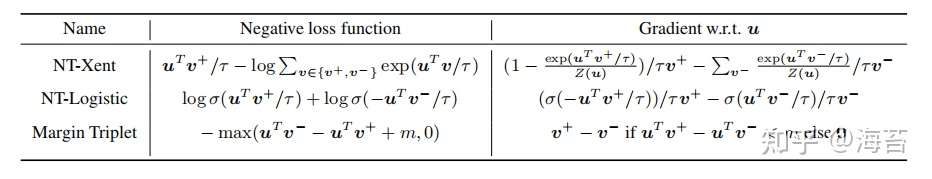 表 2. 负损失函数及其梯度。 所有输入向量,即 u、v+、v− 都经过 归一化。 NT-Xent 是“Normalized Temperature-scaled Cross Entropy”的缩写。 不同的损失函数对正例和负例施加不同的权重。