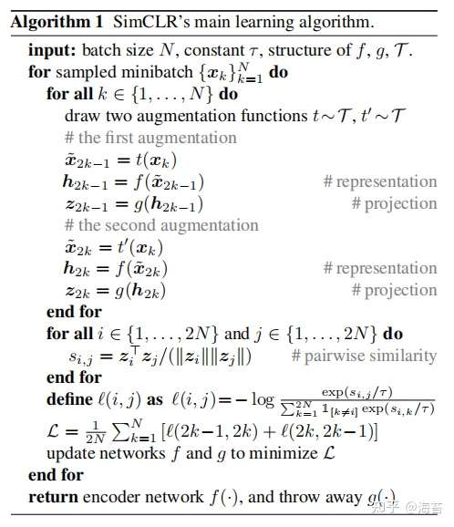 我们随机抽取 N 个示例的小批量样本,并在从小批量派生的成对增强示例上定义对比预测任务,从而产生 2N 个数据点。我们没有明确地抽样负面例子。相反,给定一个正对,类似于 (Chen et al., 2017),我们将小批量中的其他 2(N-1) 个增强示例视为负示例。让 表示
