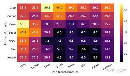 图 5. 单独或组合数据增强下的线性评估(ImageNet top-1 准确率),仅应用于一个分支。对于除最后一列之外的所有列,对角线条目对应于单个变换,非对角线对应于两个变换的组合(按顺序应用)。最后一列反映了该行的平均值。