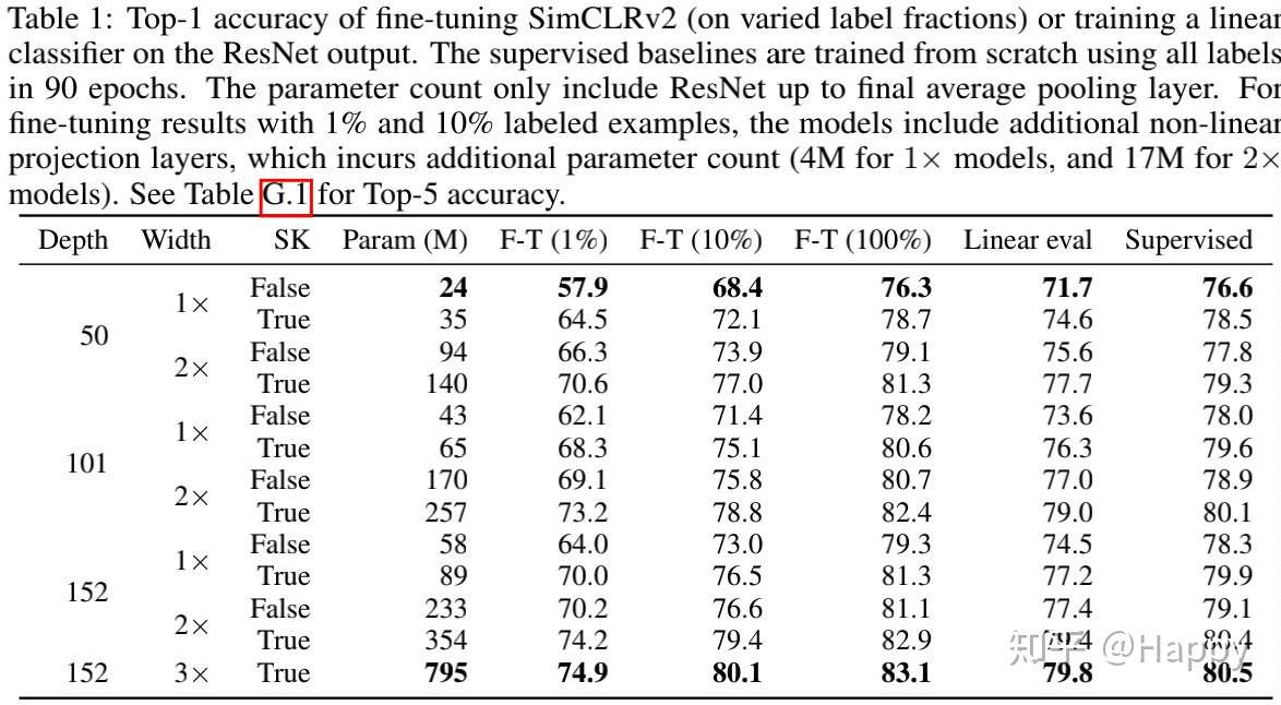 为更好的利用广义与训练能力,作者探索了更大的ResNet模型。而SimCLR预其他方法中采用的最大模型为ResNet50(4x),在这里作者采用的最大模型是带SK的ResNet152,且通道数x3。在1%有标签数据上进行微调时,ResNet50到ResNet152的改变得到29%的性能提升。