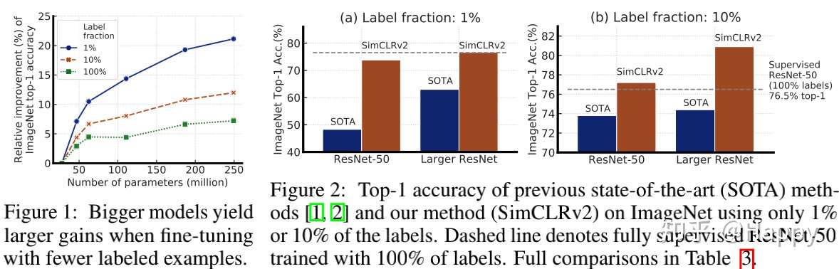 针对ResNet的无监督预训练,作者在SimCLR基础上进行了改进并称之为SimCLRv2.在仅仅采用1%和10%有标签数据时评估了所提方案的有效性,该方案主要包含下面三个贡献: