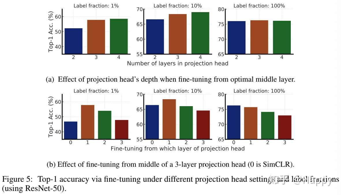 作者进一步证实了SimCLR中卷积后的非线性变换(即projection head)的重要性。更深的projection head不仅可以提升特征表达质量,同时可以提升半监督学习的性能。