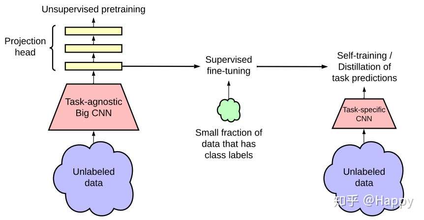 这篇比较详细的描述了如何在SimCLR基础上改进得到SimCLRv2的过程,整个思路的转换非常清晰自然。通篇看下来,最大的感觉就是它和Noisy Student相同之处真的非常多,流程与思想都非常的相似。